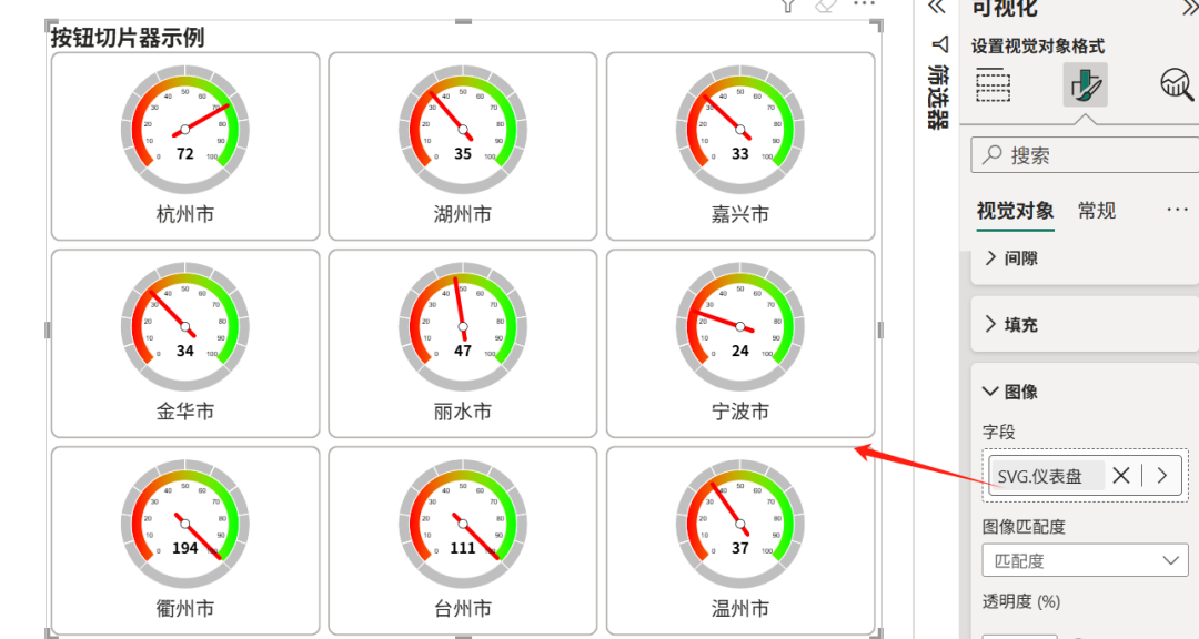 新建度量值,引用该函数,按钮切片器放入图像区域: