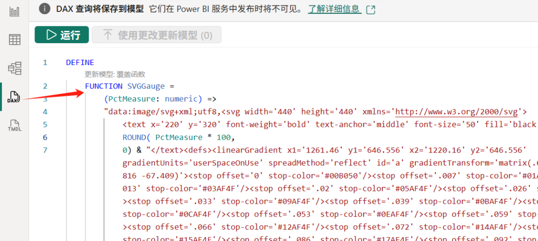 切换到DAX查询视图,粘贴代码,点击右上角的使用更改更新模型即生效。