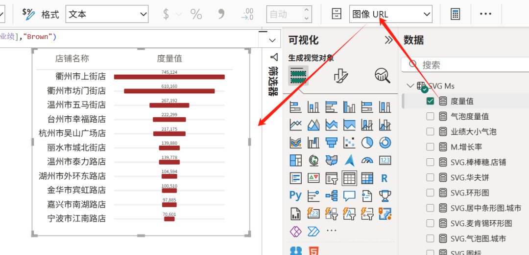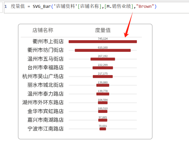 度量值 =SVG_Bar('店铺资料'[店铺名称],[M.销售业绩],"Brown")
