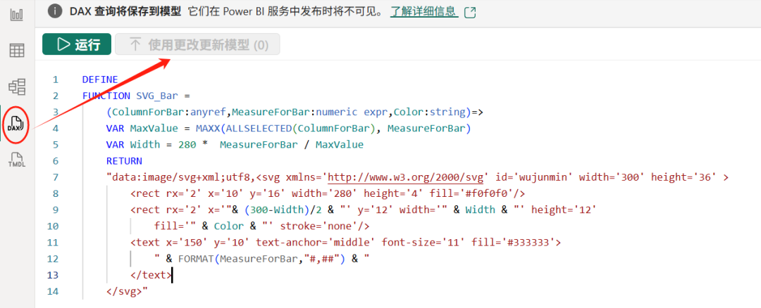 切换到DAX查询视图,粘贴代码,点击右上角的使用更改更新模型即生效。
