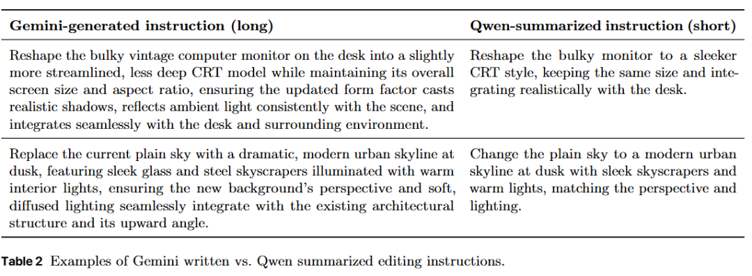 类型 II:简洁的用户风格指令。为了研究模型生成和人类风格编辑指令之间的差距,启动了一个专门的标注项目,为一部分图像收集人类指令。然后,我们将这些人工编写的示例作为上下文演示提供给 Qwen2.5-7B-Instruct 的系统提示,后者将指令重写为简洁的用户风格形式。这样就为相同的图像/编辑意图生成了另一种指令,更好地反映了最终用户通常如何表达请求。示例见表 2。