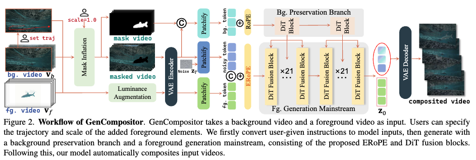 本文介绍了一种新颖的视频编辑任务——生成式视频合成,允许使用动态视觉元素进行交互式视频编辑。具体来说,开发了第一种生成方法GenCompositor,旨在解决该任务的三个主要挑战:保持编辑前后的内容一致性、注入视频元素以及促进用户控制。它包含三个主要贡献。首先,利用轻量级背景保护分支将背景视频的令牌注入主流。其次,前景生成主流包含新颖的DiT融合块,以有效融合外部视频条件与背景隐空间表示。最后,本文修订了一种新颖的位置嵌入ERoPE,以强制模型自适应地将外部元素添加到结果中所需位置和所需尺度。请注意,ERoPE指出了一种新的有效方法,可以在没有任何额外计算成本的情况下,利用布局未对齐的视频条件进行生成模型。本文还提出了第一个配对数据集VideoComp。综合实验证明了我们提出方法的有效性和实用性。