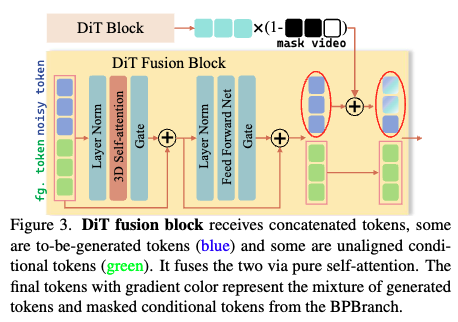 随后,将这些注入到前景生成主流中以进行视频合成。由于BPBranch被设计为仅注入背景,其主要目的是将掩码视频特征与主流模型的隐空间表示对齐。我们没有深入分析掩码特征,而是简单地设计了一个轻量级的控制分支,该分支由两个普通的DiT块组成,以与主流的隐空间表示对齐。同时,由于我们只想使用其输出的背景区域,应用了一种掩码令牌注入方法来防止BPBranch对生成的前景内容产生干扰,其公式为: