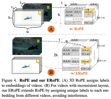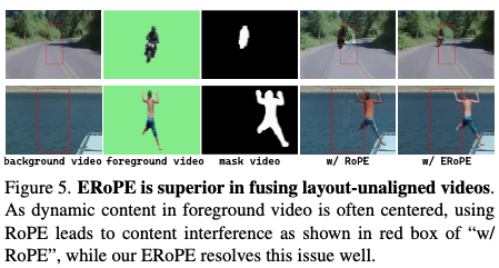 为此,本文开发了一种新的嵌入策略,专门针对前景素材与背景视频之间未对齐的特性,称为ERoPE。ERoPE以更忠实的方式融合未对齐的视频,且无需额外的训练参数。如下图4B所示,扩展了RoPE范围,并在高度维度上为两个未对齐视频的每个嵌入分配一个唯一的位置标签,严格交错两个视频的特征位置。如下图5所示,此策略有效提高了合成性能并消除了由未对齐内容干扰引起的伪影。我们提出的ERoPE可以利用任意布局未对齐的视频条件而无需额外的训练参数,此处我们将其用于视频合成。