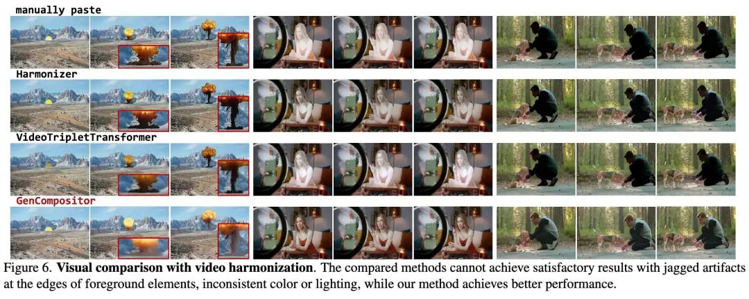 考虑到视频协调领域中开源方法的数量有限,我们将本文的方法与两个最近可用的方法进行比较:Harmonizer和VideoTripletTransformer 。由于这些方法无法控制运动轨迹,我们只比较协调前景元素的能力。我们还手动将来自其他源的前景素材粘贴到背景视频中进行比较。如下图6左侧所示,由于前景视频分割掩码的不完美,手动粘贴和Harmonizer在添加元素的边缘出现明显的锯齿状伪影。此外,在这些协调方法中,新添加的爆炸效果的颜色风格与背景视频不协调。相比之下,本文的方法有效解决了由不准确掩码引起的这些锯齿状伪影,并产生更协调的结果。在下图6的其他示例中,我们手动调整前景元素的照明并测试视频协调能力。本文的方法始终优于其他方法,证明了其优越性。