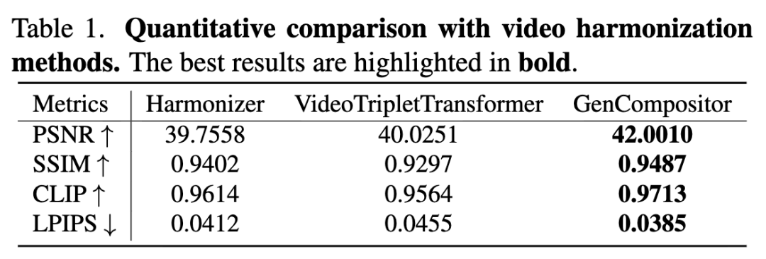 为了进行定量比较,本文使用著名的HY-YouTube数据集,其中包含前景视频、分割掩码和源视频。使用四个著名指标PSNR、SSIM、CLIP和LPIPS在下表1中衡量性能。GenCompositor在所有指标上均优于其他协调方法,显示其在视频协调方面优于专门方法。