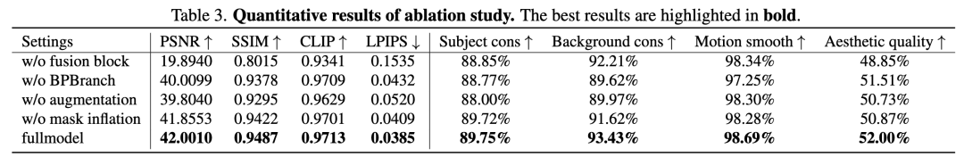 为了分析每个提出组件的有效性,我们进行了四种设置的消融研究。具体来说,我们尝试了GenCompositor的两种潜在设计:一种移除了背景保护分支(w/o BP-Branch),另一种使用交叉注意力注入前景元素而不使用提出的DiT融合块(w/o fusion block)。本文删除了两种设计:一种不对二值掩码进行膨胀(w/o mask inflation),另一种直接输入原始前景视频进行训练,不使用亮度增强(w/o augmentation)。