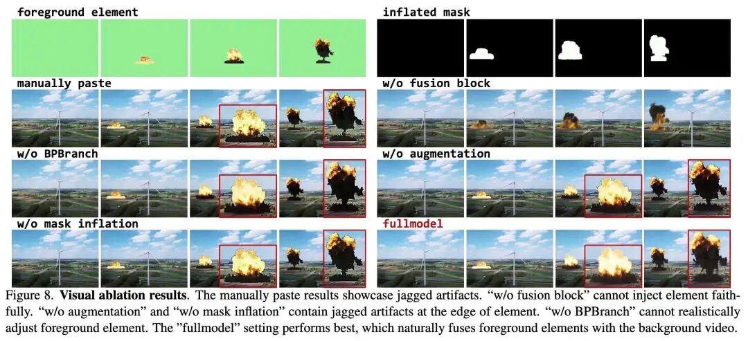 视觉比较如下图8所示,其中我们在第一行提供了输入前景元素和膨胀后的掩码。以下三行显示了不同设置的结果。一个有趣的观察是,“手动粘贴”、“w/o augmentation”和“w/o mask inflation”的结果都在前景元素的边缘表现出明显的锯齿状伪影。我们认为,对于“w/o augmentation”,由于网络强大的学习能力,它完全继承并过拟合了前景视频的内容,未进行任何调整。对于“w/o mask inflation”,由于我们向模型提供了像素对齐的掩码,它只能在这个有限区域内处理前景元素,无法调整周围像素以与背景融合,从而在边缘留下伪影。另外两种设置解决了边界伪影问题,但存在其他局限性。“w/o fusion block”无法忠实地注入前景元素的ID和详细运动,但成功预测了火焰,这在语义上与前景条件一致,表明交叉注意力擅长注入语义信息,但在本文的任务中不适用。尽管“w/o BPBranch”也产生了逼真的背景,但这种对背景视频和添加前景元素的端到端学习增加了训练难度,限制了其性能。在其结果中,前景元素与主视频在感知上不一致。