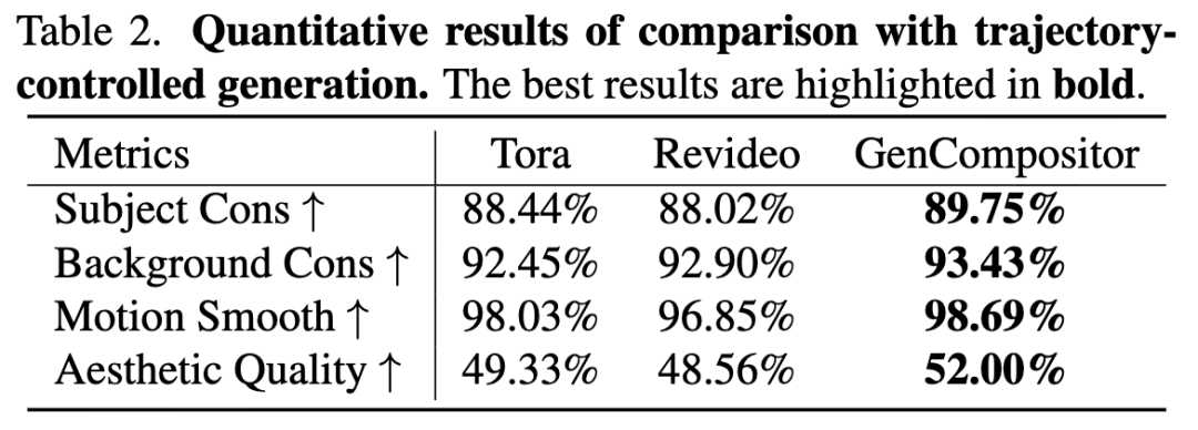 为了进行定量评估,本文利用一个常见基准VBench,从4个维度分析生成质量:1)主体一致性:视频中主体的一致性。2)背景一致性:视频背景的一致性。3)运动平滑度:生成视频的运动质量。4)美学质量:视频的主观视觉质量。我们认为这四个指标与本文的任务最相关,并分别使用Tora、Revideo和本文的方法生成40组视频。如下表2所示,本文的方法在所有四个指标上取得了最佳平均分数。此外,我们在补充材料的第10节进行了用户研究,以比较不同方法的直观质量。