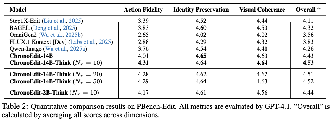 使用时序推理后,ChronoEdit-14B-Think () 实现了 4.53 的新的最先进总分,尤其在动作保真度上有显著提升(4.31)。这突显了显式时序推理对于需要更深层次理解物理一致性的编辑任务的价值。值得注意的是,ChronoEdit-2B-think () 的性能与 ChronoEdit-14B 相当,仅略低于 ChronoEdit-14B-Think。