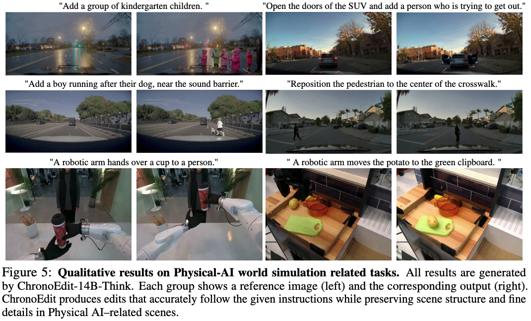 ChronoEdit 在物理 AI 任务上的表现。 下图 5 展示了 ChronoEdit 处理广泛物理 AI 世界模拟任务的能力。这些结果证明了该模型在从自动驾驶动力学到机器人物体操作等各种世界模拟任务领域中具有很强的泛化能力。