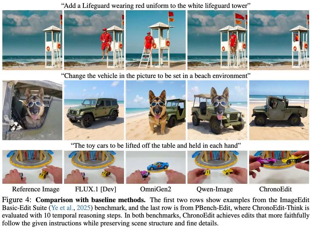 与基线的比较。 我们在各种具有挑战性的场景下,将我们的方法与最先进的图像编辑方法进行比较。如下图 4 所示,ChronoEdit 持续产生高质量的结果,展现出具有竞争力的整体性能,尤其是在需要精确建模动态姿态和交互的面向动作的编辑中具有明显优势。这些结果突显了我们的视频推理在处理传统编辑方法通常难以应对的、基于时间的复杂编辑任务方面的有效性。