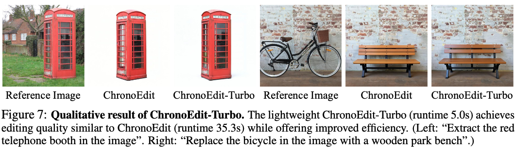 ChronoEdit-Turbo。 在下图 7 中进一步可视化了 ChronoEdit 和 ChronoEdit-14B-Turbo 的定性比较。ChronoEdit 和 ChronoEdit-Turbo 都以相当的视觉保真度成功执行了编辑,保留了场景结构和精细细节。这表明轻量级的 ChronoEdit-Turbo 变体实现了与 ChronoEdit 相媲美的编辑质量,同时提供了更高的效率(运行时间 5.0 秒 vs. 30.4 秒)。