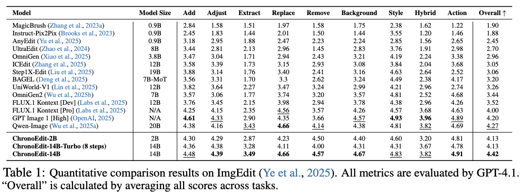 此外还报告了 ChronoEdit-2B 的结果,其规模比 ChronoEdit-14B 小 7 倍,但性能与 ChronoEdit-14B-Turbo 相当。