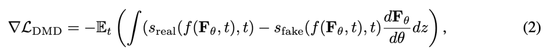 为了进一步加速推理,采用蒸馏技术来减少推理所需的步数。利用 DMD 损失来训练一个 8 步的学生模型。蒸馏目标的梯度由下式给出: