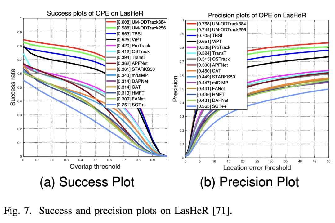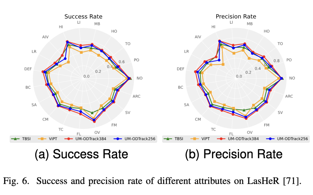 LasHeR。LasHeR 是一个大规模 RGB-T 跟踪数据集,包含 245 个短期测试视频序列。结果报告在下图 7 中,我们的 UM-ODTrack 取得了令人惊讶的结果,显著优于先前的 SOTA RGB-T 跟踪算法,在成功图和精度图上分别超过第二名 4.5% 和 6.3%。这些结果符合我们的预期,即基于门控注意力机制的特征学习可以自适应地提取和融合不同模态的特征,以提高多模态跟踪性能。同时,为了验证我们的门控感知器能够有效解决包括遮挡(NO)、部分遮挡(PO)、完全遮挡(TO)、低光照(LI)、低分辨率(LR)、形变(DEF)、背景干扰(BC)、运动模糊(MB)、热交叉(TC)、相机移动(CM)、快速运动(FM)、尺度变化(SV)、透明遮挡(HO)、高光照(HI)、突然光照变化(AIV)、相似外观(SA)、纵横比变化(ARC)、出视野(OV)和帧丢失(FL)在内的多种挑战,我们展示了 LasHeR 数据集的属性评估结果。如图 6 所示,我们的 UM-ODTrack 在每个属性上都表现良好。因此,可以表明我们带有门控感知器的视频级多模态建模方案能够有效地统一和融合多模态特征,从而使我们的跟踪器能够很好地解决复杂的跟踪场景。