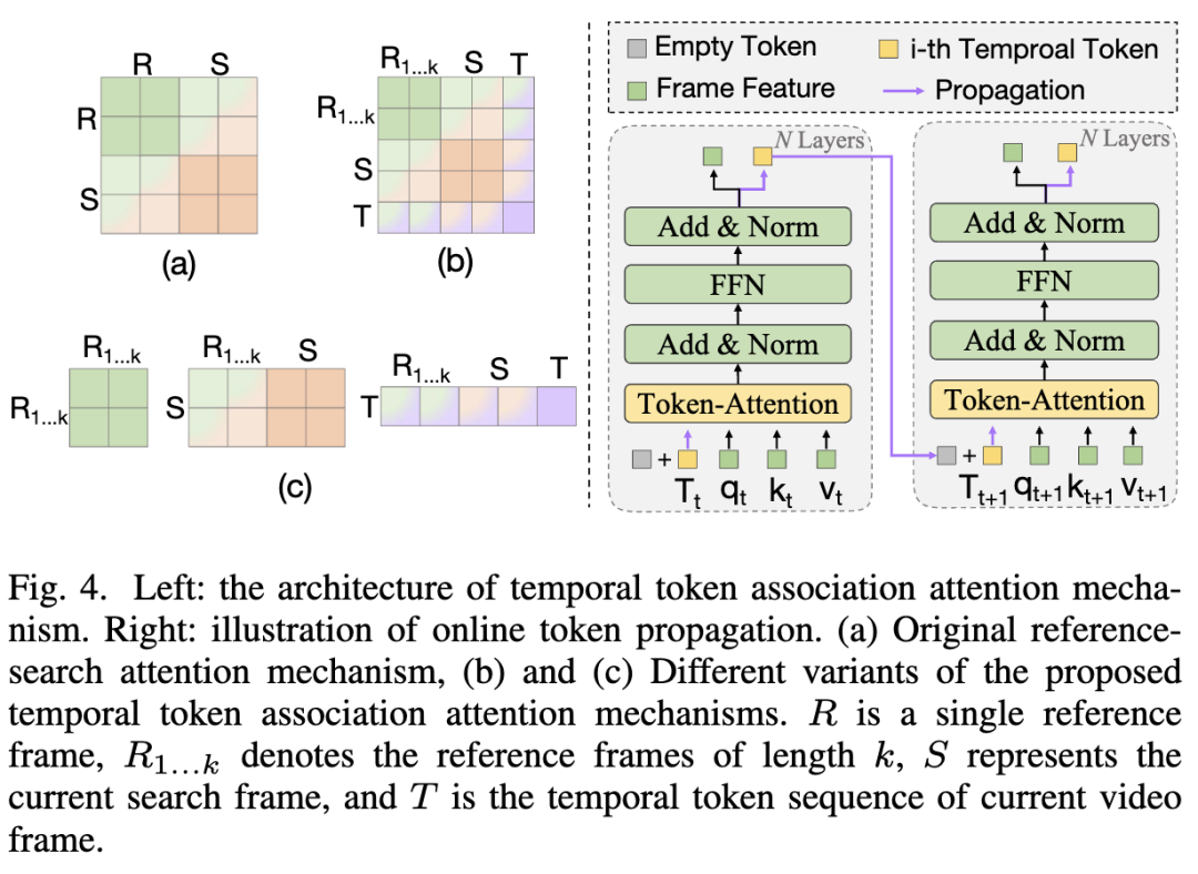 一旦目标信息被时序令牌提取,我们以自回归的方式将令牌向量从第 帧传播到第 帧,如图4(右)所示。首先,将第 帧的时序令牌 添加到第 帧的空令牌 上,得到更新后的第 帧的内容令牌 ,随后将其作为输入传播到后续帧。形式上,可见光和多模态跟踪的传播过程为: