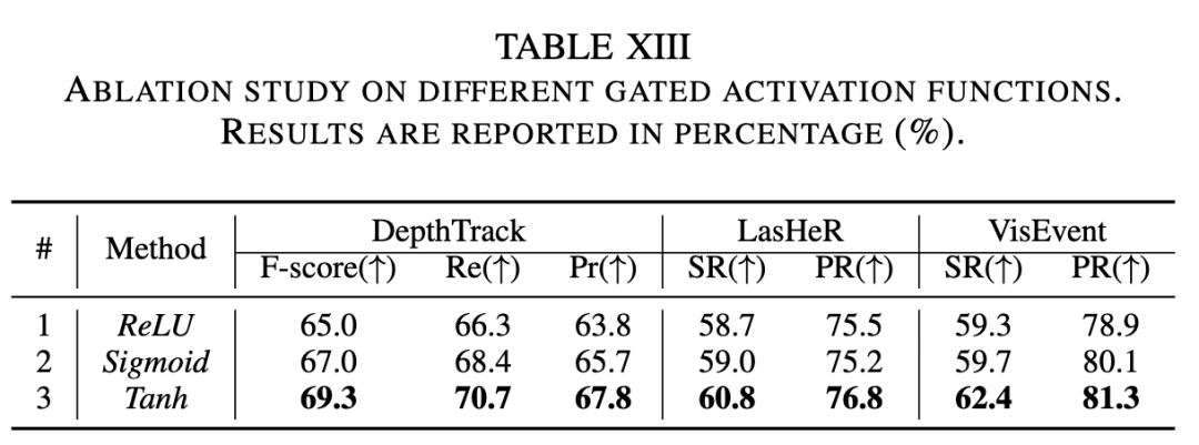 门控感知器和门控激活函数的有效性。我们进行实验以验证在通用模态感知跟踪框架下提出的两个组件,即条件门控和门控模态可扩展感知器(GMP)的有效性,如下表 X 所示。基线方法指的是 ODTrack 的双流版本。通过将条件门控模块添加到基线中,我们的跟踪器在三个下游跟踪数据集上的性能得到了改善。例如,配备条件门控的跟踪器在 DepthTrack 基准上的 F-score 指标实现了 1.3% 的提升。此外,通过将 GMP 纳入我们的模型,其性能得到进一步改善。这证明了我们提出的两个门控模块的有效性。此外,为了研究门控激活函数的效果,在表 XIII 中使用了不同的门控激活函数进行实验。与 ReLU 和 sigmoid 相比,tanh 激活函数表现最佳。这一结果表明,在我们的门控感知器中,tanh 门控函数更适合学习和表示通用的多模态跟踪任务,可能提供更好的泛化能力。