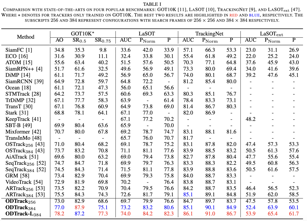 在七个可见光基准(包括 LaSOT, TrackingNet, GOT10K, LaSOText, VOT2020, TNL2K 和 OTB100)和五个多模态跟踪基准(包括 LasHeR, RGBT234, DepthTrack, VOT-RGBD2022 和 VisEvent)上将我们的 ODTrack 和 UM-ODTrack 与最先进的跟踪器进行了比较。我们的 ODTrack 和 UM-ODTrack 在这些数据集上展示了卓越的性能。