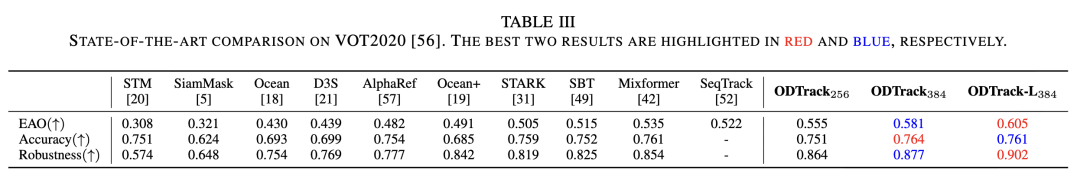 VOT2020。VOT2020 包含 60 个具有挑战性的序列,并使用二进制分割掩码作为真实标签。我们使用 Alpha-Refine作为 ODTrack 的后处理网络来预测分割掩码。期望平均重叠率(EAO)指标用于评估所提出的跟踪器和其他先进跟踪器。如表 III 所示,我们的 ODTrack384 和 -L384 在掩码评估上取得了最佳结果,EAO 分别为 58.1% 和 60.5%。在 EAO 指标上,与未探索时序关系的跟踪器(即 SBT 和 Ocean+)相比,ODTrack 分别优于 6.6% 和 9%。这些结果表明,通过注入时序令牌注意力,我们的 ODTrack 在复杂跟踪场景中具有鲁棒性。