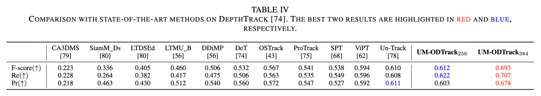DepthTrack。DepthTrack包含 150 个训练和 50 个测试 RGB-D 长期视频序列。如下表 IV 所示,我们在其上将我们的模型与现有的 SOTA RGB-D 跟踪器进行了比较。在相同的图像分辨率设置下,我们的 UM-ODTrack256 在跟踪精度(Pr)、召回率(Re)和 F-score 上分别优于 ViPT 1.1%、2.6% 和 1.8%。此外,由于提出的高效门控注意力机制,我们的 UM-ODTrack384 在 RGB-D 跟踪领域取得了 SOTA 性能。值得注意的是,当输入尺寸从 256 增加到 384 时,UM-ODTrack 在性能上取得了大幅提升。这表明我们结合大输入分辨率的时序关联方法在多模态长期跟踪场景中尤为重要。
