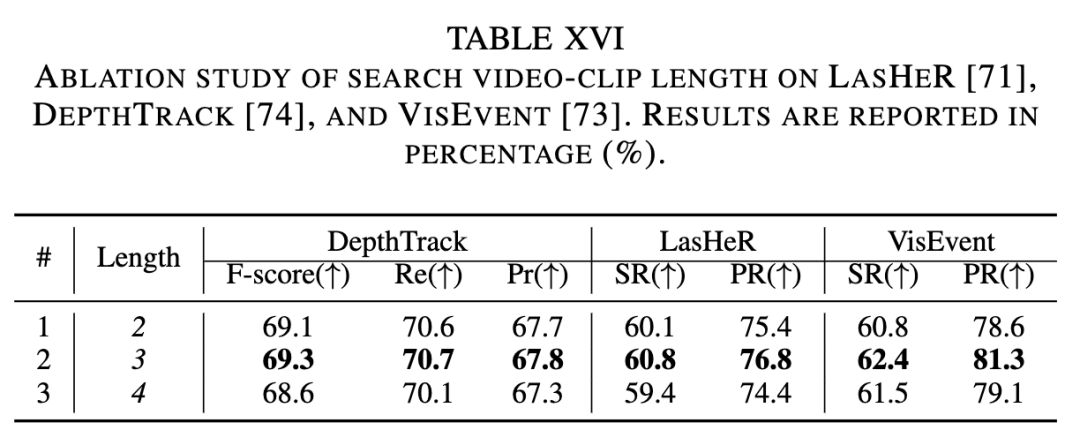 搜索视频片段的长度。如下表 VIII 所示,消融了搜索视频序列长度对跟踪性能的影响。当视频片段长度从 2 增加到 3 时,AUC 指标提高了 0.3%。然而,序列长度的持续增加并未带来性能提升,表明过长的搜索视频片段会给模型带来学习负担。因此,我们应选择适当的搜索视频片段长度。此外,为了评估序列长度对多模态跟踪性能的影响,在 LasHeR, DepthTrack和 VisEvent 基准上进行了对比实验,如表 XVI 所示。视频序列长度的选择对于利用时序信息至关重要。当序列长度从 2 增加到 3 时,我们的跟踪器在 LasHeR, DepthTrack 和 VisEvent 基准上的 SR 和 F-score 分别提高了 0.7%, 0.2% 和 1.6%。这些增益来自于通过多帧信息有效建模目标外观变化和运动轨迹。然而,当序列长度超过 3 时,由于跨模态时序噪声的积累,性能趋于稳定或略有下降。这证实了适当选择的序列长度可以提供互补信息,而过长的序列更可能引入冗余或有噪声的上下文信号。因此,我们的 UM-ODTrack 采用序列长度 3 作为最佳设置,以在合适的时间跨度内捕获上下文信息。