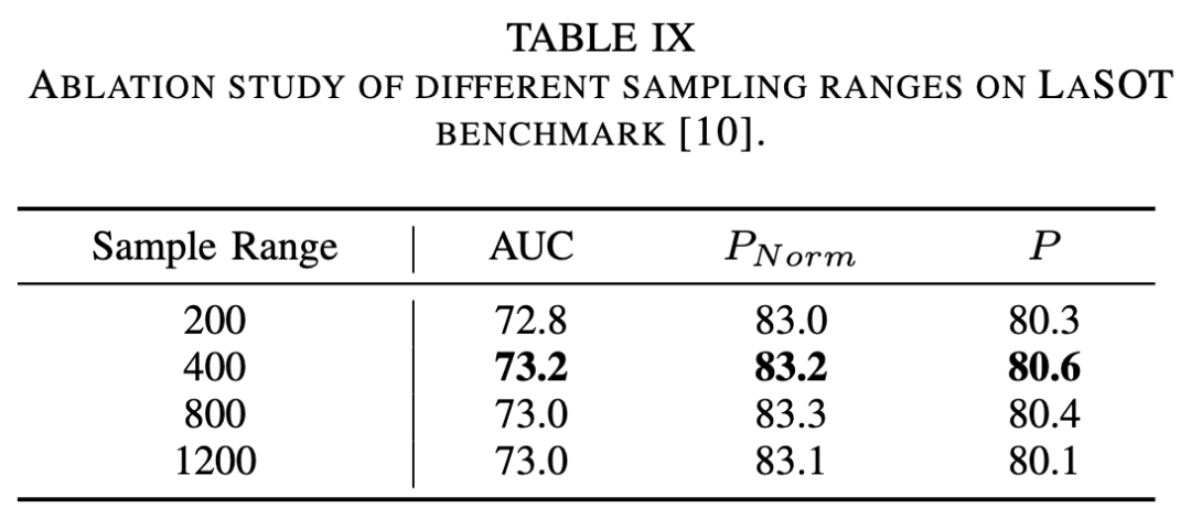 采样范围。为了验证采样范围对算法性能的影响,在下表 IX 中对视频帧的采样范围进行了实验。当采样范围从 200 扩大到 1200 时,AUC 指标的性能有显著提高,表明视频级框架能够从更大的采样范围学习目标轨迹信息。