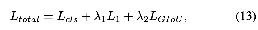 具体来说,采用焦点损失作为分类损失 ,并采用 L1 损失和 GIoU 损失作为回归损失。总损失 可以公式化为: