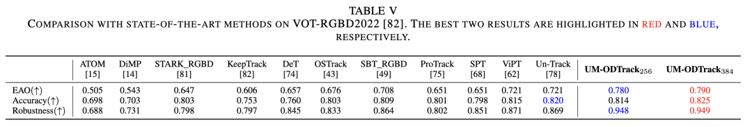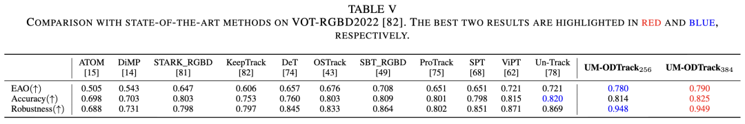 VOT-RGBD2022。VOT-RGBD2022是一个短期跟踪数据集,包含 127 个 RGB-D 视频序列。如下表 V 报告,与大多数其他跟踪算法相比,我们的跟踪器取得了新的最先进结果。具体来说,我们的 UM-ODTrack256 在 EAO、准确性和鲁棒性指标上分别获得了 78.0%、81.4% 和 94.8% 的分数。与最新的统一跟踪器 Un-Track 相比,我们的 UM-ODTrack256 在期望平均重叠率(EAO)和鲁棒性分数上分别实现了 5.9% 和 7.9% 的提升。这表明我们的统一建模技术对于通用特征学习更有效,并且可以为每种模态(即深度模态)提供合适且稳定的特征空间。