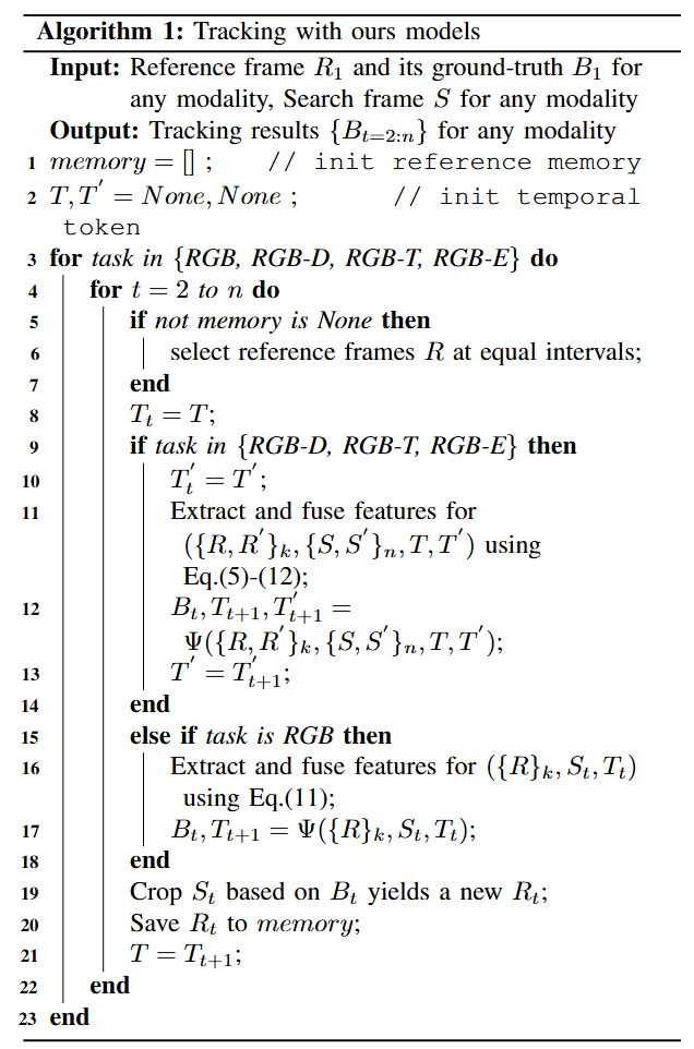通用推理。 算法1总结了我们模型的推理过程。对于 RGB 跟踪,我们遵循与其他transformer跟踪器相同的跟踪流程。得益于我们的一次性训练方案和门控模态可扩展感知器模块,对于 RGB-D、RGB-T 和 RGB-E 跟踪任务,我们使用同一套模型参数无缝地执行任何跟踪任务的推理,而无需额外的多次微调技术。在输入数据方面,为了与训练设置保持一致,我们在推理阶段将三个等间隔的参考帧纳入我们的跟踪器。同时,搜索帧和时序令牌向量被逐帧输入。