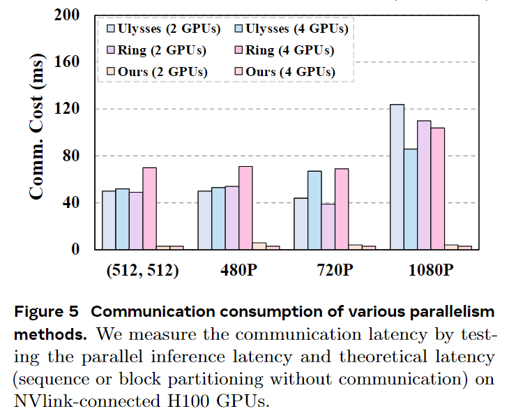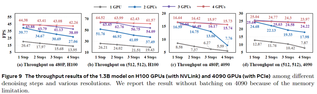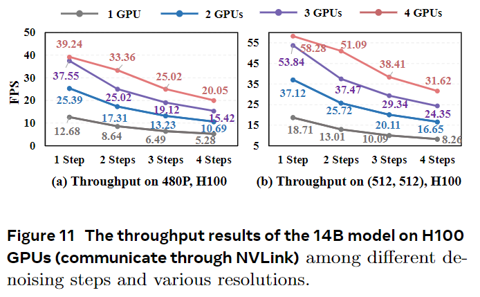 多pipeline编排扩展 (Multi-pipeline orchestration extension) 。为了在多GPU平台上提升系统吞吐量,本文提出了一种可扩展的pipeline编排方案用于并行推理。具体来说,DiT的模块被划分到不同的设备上。如图7所示,每个设备将其输入序列作为一个微步(micro-step)进行处理,并在一个环形结构内将结果传输到下一个阶段。这使得模型的连续阶段能够以pipeline并行的方式并发运行,从而在DiT的吞吐量上实现近线性的加速。