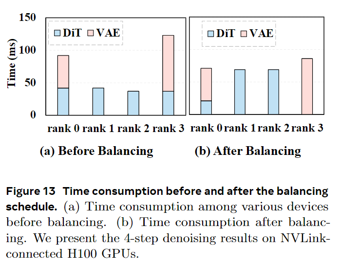 DiT块调度器 (DiT block scheduler) 。静态分区常常会产生不均衡的工作负载,因为第一个和最后一个排名除了处理DiT块外,还要处理VAE的编码和解码,如图13(a)所示。这种不平衡会导致pipeline停顿和利用率降低。本文引入了一个轻量级的、在推理时运行的DiT块调度器,它根据测量的执行时间动态地在设备之间重新分配模块。该调度器会搜索一个最优的分区方案,以最小化每个阶段的延迟,如图13(b)所示,从而显著减少了整体的pipeline气泡。