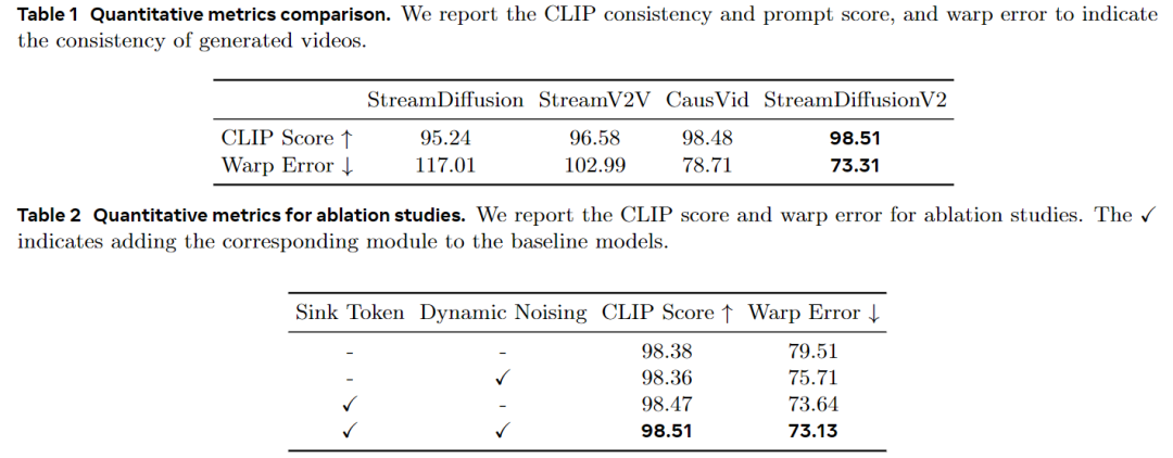 StreamDiffusionV2在无需TensorRT或量化的情况下,实现了0.5秒内首帧渲染,并在4个H100 GPU上以14B参数模型达到58.28 FPS,以1.3B参数模型达到64.52 FPS。即使增加去噪步骤以提升质量,仍保持31.62 FPS(14B)和61.57 FPS(1.3B)。系统在不同分辨率、去噪步数和GPU规模下表现出色,支持从低延迟到高品质的灵活权衡,并在CLIP分数(98.51)和Warp Error(73.31)等指标上超越基线,显著改善长时序一致性和运动处理能力。