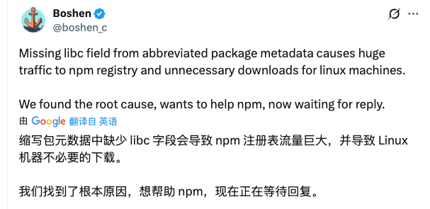 libc,一股脑儿把两个版本都下下来即使操作系统只需要其中一个application/json) → 响应体可能从 2KB 暴涨到 200KB+,解析变慢了很多倍拿 esbuild 举例,glibc 版本 1.8 MB,musl 版本 1.9 MB,如果 npm registry 加上 libc 字段,能省 1.9 MB 流量。