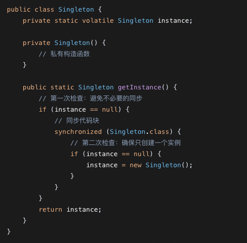 private static volatile Singleton instance;volatile在这里解决了指令重排序问题,这是很多开发者容易忽略的关键点。