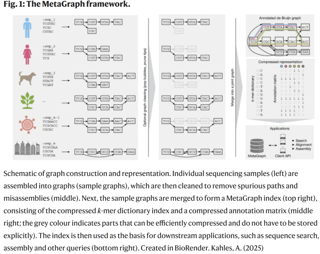 MetaGraph采用压缩的 de Bruijn图 表示大规模序列集合。每个节点代表一个固定长度的k-mer,边表示相邻序列关系。为了应对超大规模数据,研究人员使用分布式哈希表和压缩位向量存储图结构,从而在保持可搜索性的同时大幅降低存储需求。