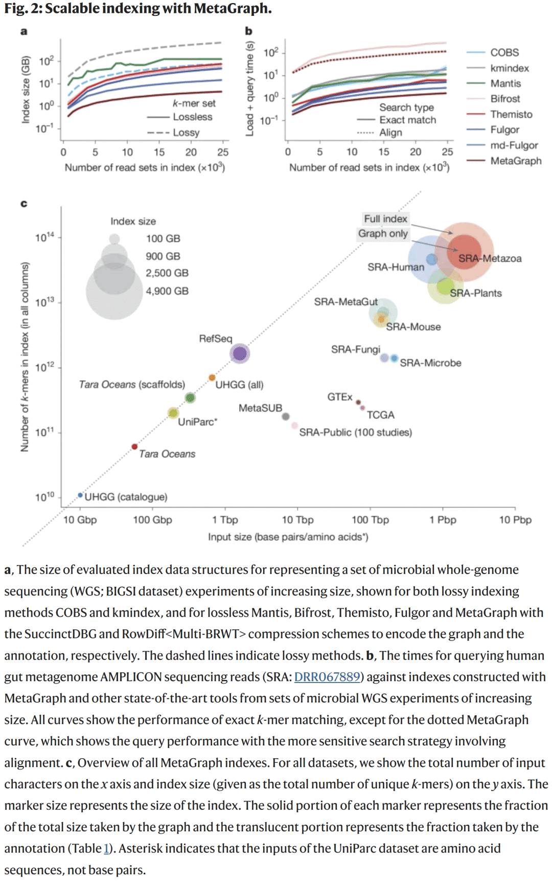 此外,MetaGraph通过“分层索引策略”组织不同来源的数据(例如人类、病毒、环境样本),并利用增量更新机制实现快速扩展,无需重建整个索引。