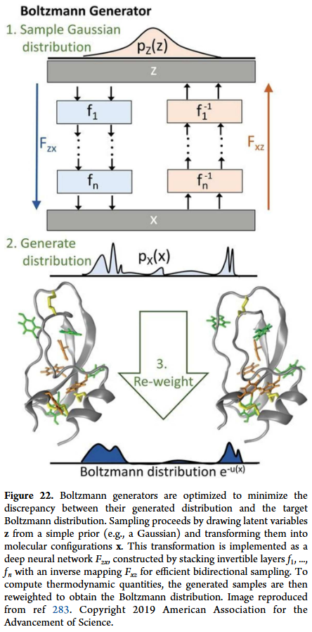 • Boltzmann 生成器:通过正向与逆向流学习Boltzmann分布,可在能量面上直接生成样本。
