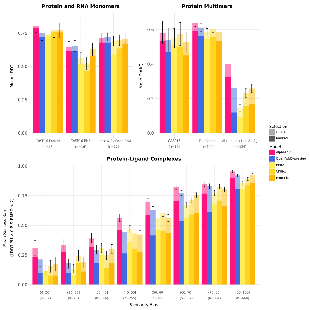 与其他可商用的 AF3 复现模型一样,OpenFold3 在某些模式/应用上确实落后,而在其他方面则达到或超越了 AlphaFold3。