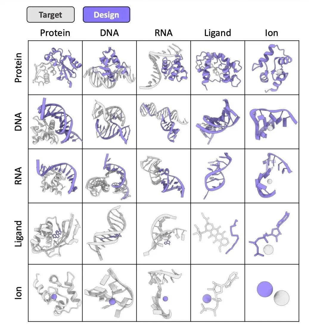 ODesign的出现打破了这一壁垒。它像是一位能同时理解蛋白、核酸、小分子和金属离子等生命分子的“通用分子生物学家”,既理解它们在形状、能量和电荷分布上的规律,也能掌握它们相互作用的底层法则,从而实现逆向设计。ODesign作为一种通用的世界模型,能在原子层面上像搭积木一样精准构筑新的相互作用模式。由此,研究者可以像编程一样指定靶标分子的表位或口袋,在统一范式下完成不同形态分子的一键式可控设计。