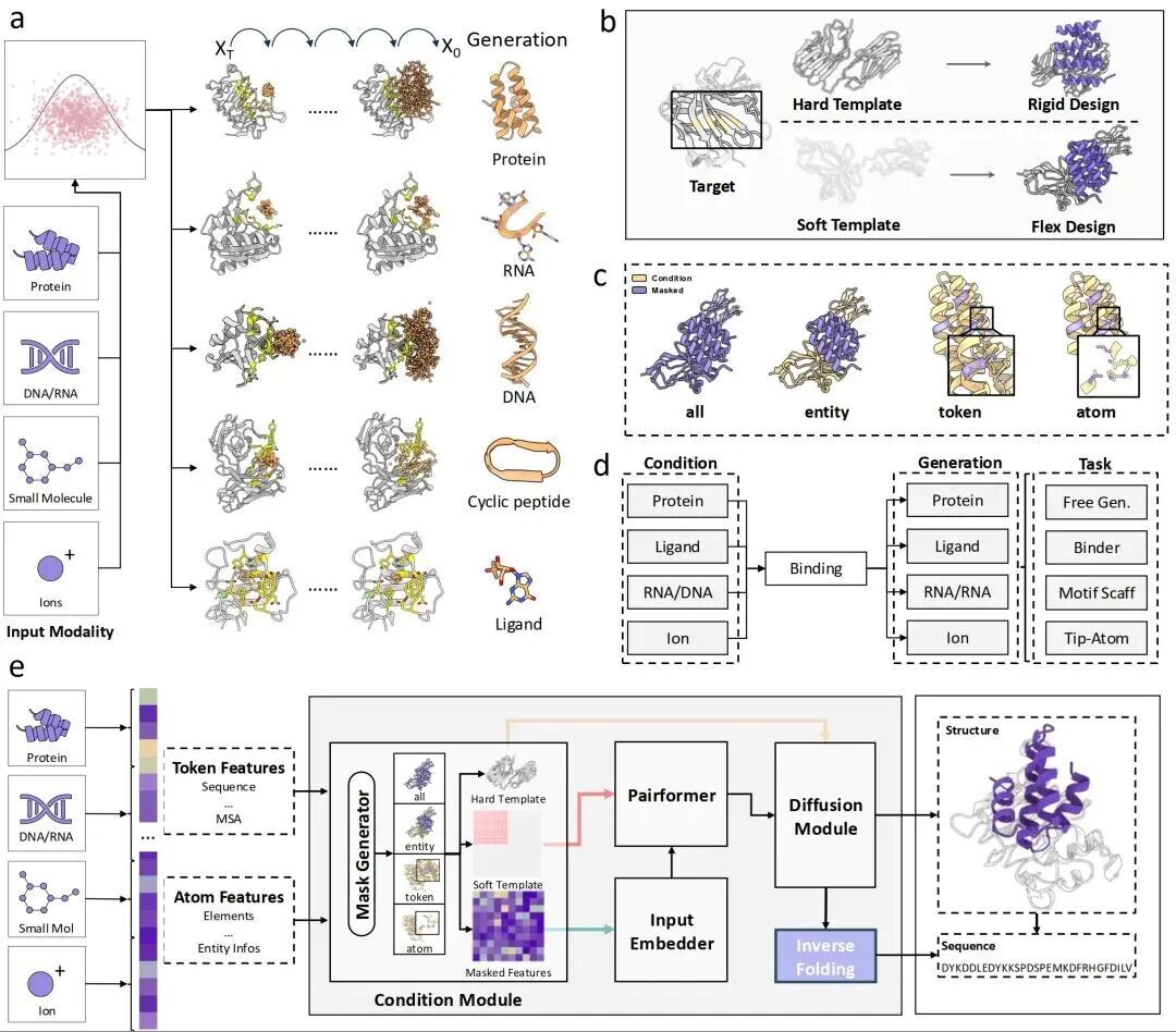 图 2 | ODesign通用分子设计框架概览,通过统一掩码机制与扩散生成架构,ODesign在刚性与柔性构象下均可精准控制分子交互,实现可编程的生物设计。