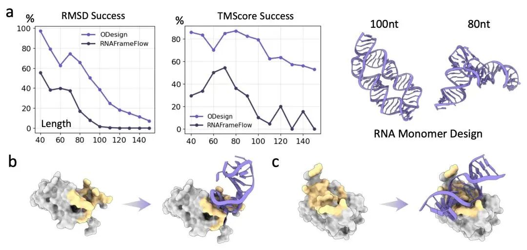 核酸作为另一类具有序列可编程性的生物分子,在分子识别、基因调控与药物开发中发挥着关键作用。然而由于结构数据相对稀疏,现有设计方法局限单一模态,且滞后于蛋白设计领域。ODesign融合多模态分子数据,实现DNA和RNA的统一生成体系,并在60nt的RNA和DNA单体设计任务中实现约60%和20%的RMSD成功率,且生成的复合物具有合理的分子相互作用界面。