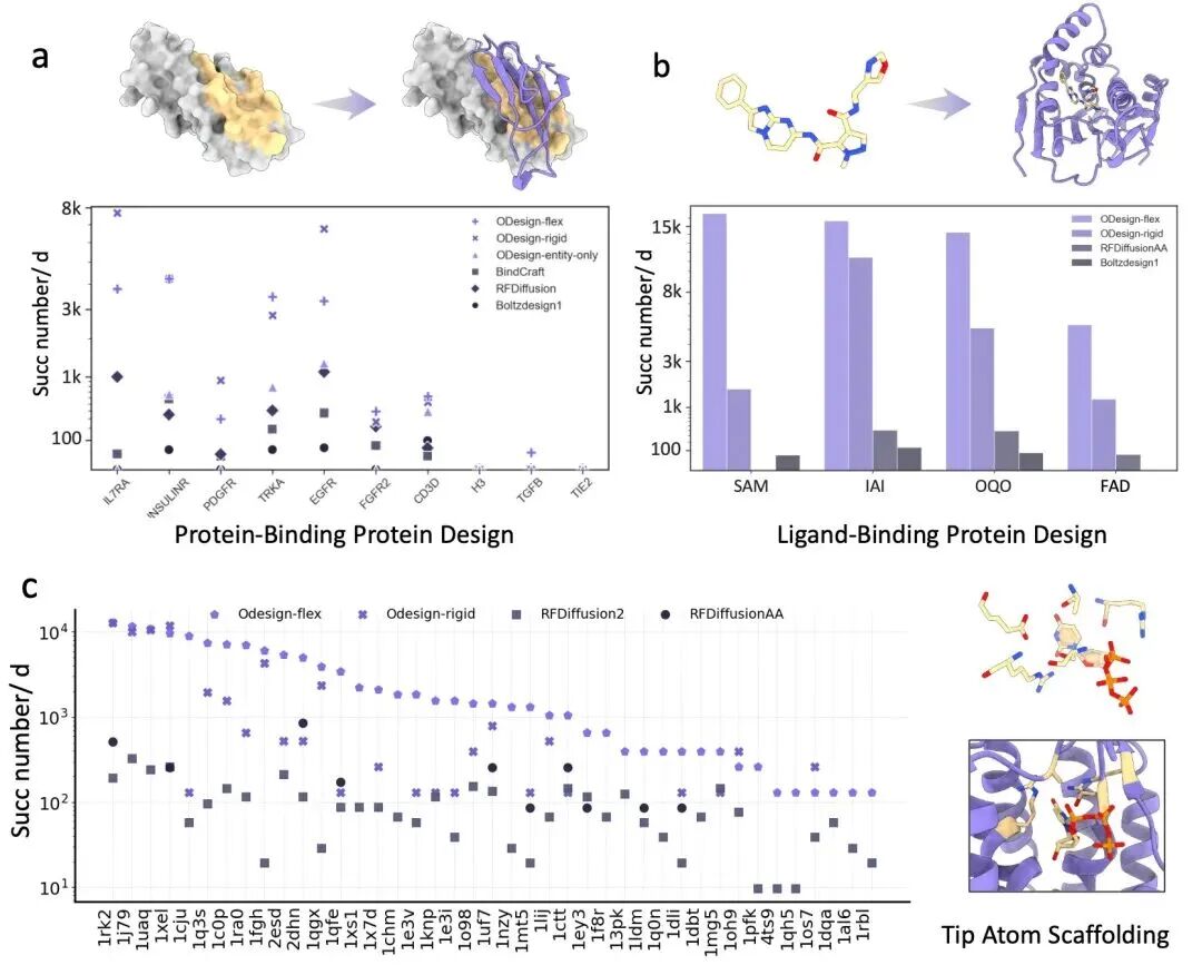 图 3 | ODesign在蛋白设计任务中展现速度与精度的双重优势。a) ODesign与BindCraft、RFDiffusion及BoltzDesign以单块GPU每日成功设计数量为指标进行比较,ODesign具有显著优势;b) MotifBench基准测试上,ODesign取得相比于RFDiffusion和RFDiffusion-AA更高的蛋白设计成功率。C) 在AME数据集上,ODesign在基于骨架的设计上比 RFDiffusion-AA 和 RFDiffusion2 有显著优势。