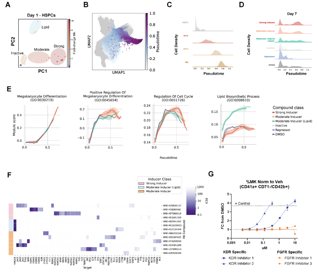 为了探讨化学诱导巨核生成的驱动因素,在巨核谱系中构建了伪时间轨迹,涵盖转录验证实验中的所有细胞(图5B)。分析结果显示,巨核分化与发育相关的基因集在伪时间维度上于所有化合物类别中表现出一致的表达模式(图5C-D),表明巨核分化遵循单一程序,而不受具体化学扰动类型的影响。调节脂质代谢的化合物在所有时间点和细胞类型中均呈现一致作用模式,但效果更为显著(图5E)。这些结果揭示了调控巨核谱系分化的多重机制,HMGCR被鉴定为潜在的巨核谱系诱导靶点,KDR等多种酪氨酸激酶的抑制可能是化学扰动下强效诱导巨核生成的关键驱动力。