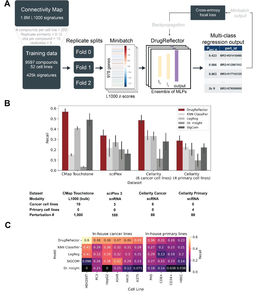 DrugReflector是一个由三个MLP分类器组成的集成模型,用于将扰动诱导的组学特征与其对应的化合物匹配。训练数据来自Connectivity Map(CMap)的一个高质量子集,经过筛选以确保化合物的可追溯性、特征的可靠性以及生物覆盖面的广泛性(图2A)。