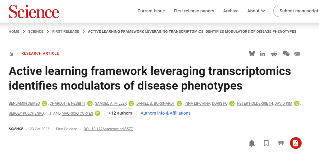 针对上述问题,来自Cellarity公司、亥姆霍兹联合会以及麻省理工学院的研究团队于2025年10月23日在《Science》期刊上发表题为“Active learning framework leveraging transcriptomics identifies modulators of disease phenotypes”的研究论文。