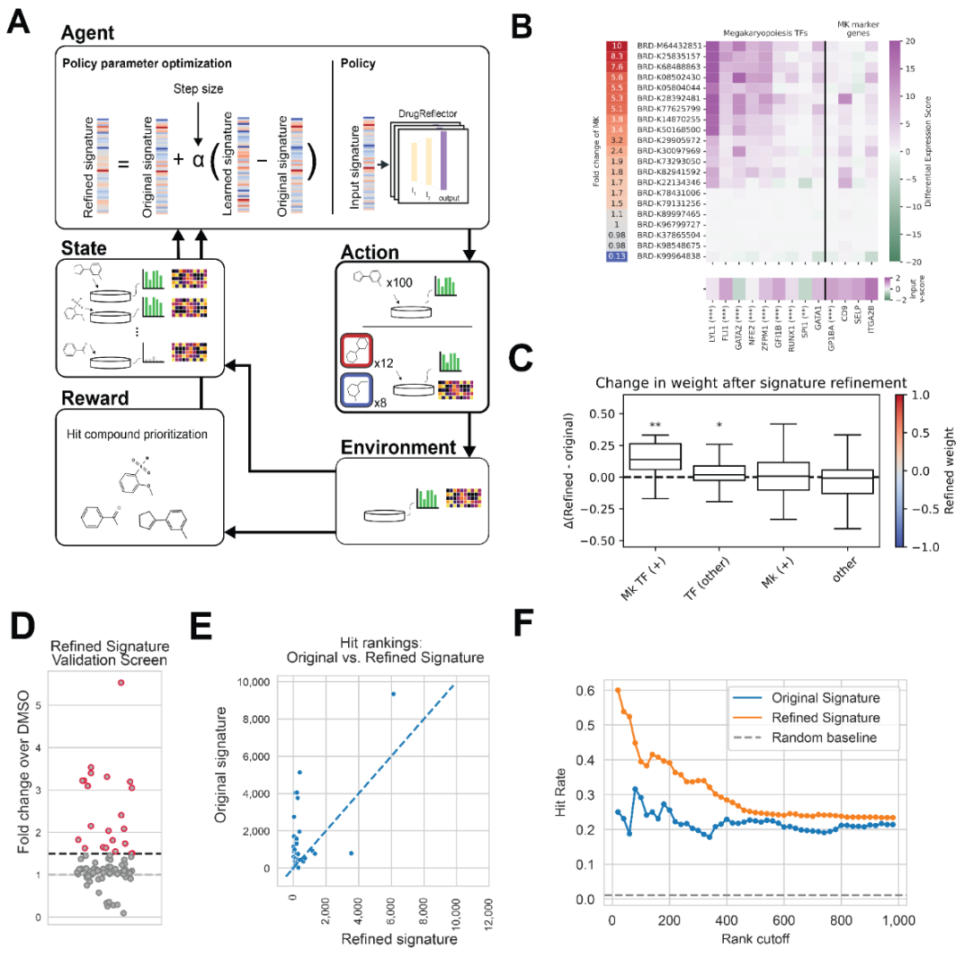 使用优化后的signature作为输入,对DrugReflector排序所有化合物并测试96种新优先化合物(此前未筛选过)。在通过质控的85种化合物中,识别出22种新hit化合物(图4D)。对比原始与优化后筛选的hit化合物排名,结果显示优化signature更能优先排列hit化合物(图4E)。进一步绘制了命中率随排名阈值变化曲线,显示前100个化合物的命中率约提升2倍,500个化合物后趋于平稳(图4F)。