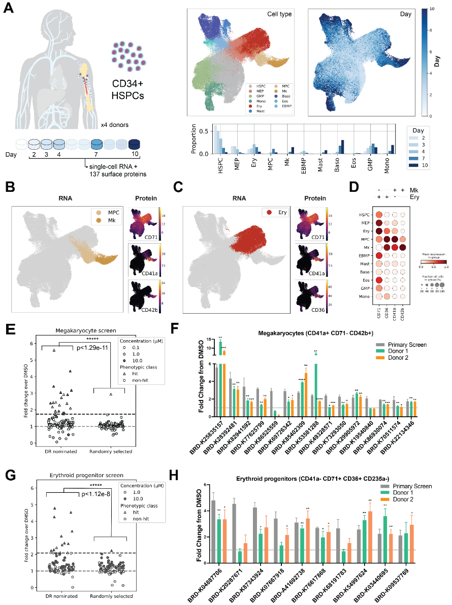 作者选择了人源CD34⁺造血干/祖细胞(HSPCs)作为筛选对象,利用本研究提出的框架,调控巨核细胞与红系祖细胞的谱系分化命运。为了表征参与巨核与红系谱系分化的细胞状态,作者分析了之前生成的一份CITE-seq数据集。该数据集整合了RNA与蛋白表达数据,涵盖了来自4位健康供体的原代HSPCs的转录组和134种细胞表面蛋白标志物。样本在10天的培养时间内,分5个时间点采集(图3A)。进一步确认了由RNA定义的细胞类型在巨核与红系谱系上均表达预期的表面标志物(图3B-D)。
