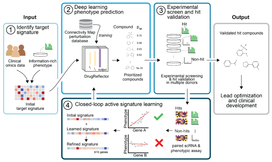 作者提出的表型药物发现框架的核心是一个闭环主动强化学习(ARL)流程,用于筛选能够调控目标表型的化合物(图1)。具体步骤如下,1)目标特征识别。分析临床数据集,以确定与目标细胞转变相关的转录特征,并将其与表型试验进行校准,确保该特征的诱导与目标表型呈正相关。2)深度学习表型预测。开发了深度学习模型DrugReflector,用于预测最有可能诱导该目标特征的化合物。3)实验筛选与验证。对预测出的化合物进行实验性表型筛选,并在多个供体样本中验证活性化合物。这些被验证的命中化合物(hits)构成了框架的主要输出,可用于后续药物开发。4)闭环优化。引入主动特征学习,利用hit与非hit化合物的联合转录组和表型测量数据进行闭环反馈,从而不断优化输入特征并提升命中率。