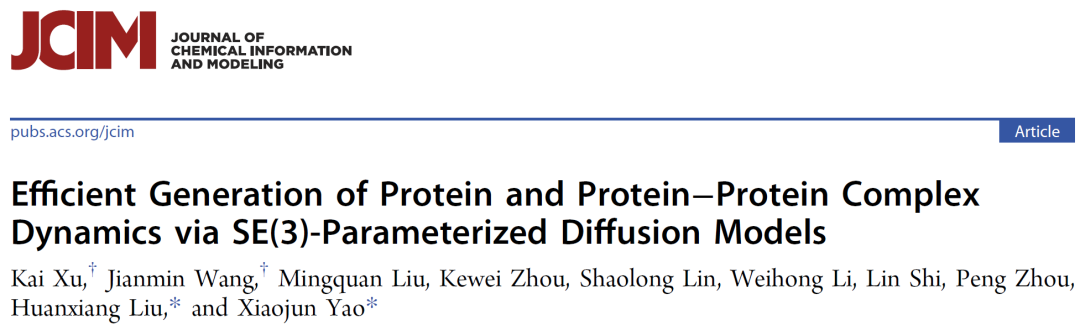 Kai Xu, Jianmin Wang, Mingquan Liu, Kewei Zhou, Shaolong Lin, Weihong Li, Lin Shi, Peng Zhou, Huanxiang Liu, and Xiaojun Yao. "EEfficient Generation of Protein and Protein–Protein Complex Dynamics via SE(3)-Parameterized Diffusion Models." Journal of Chemical Information and Modeling;